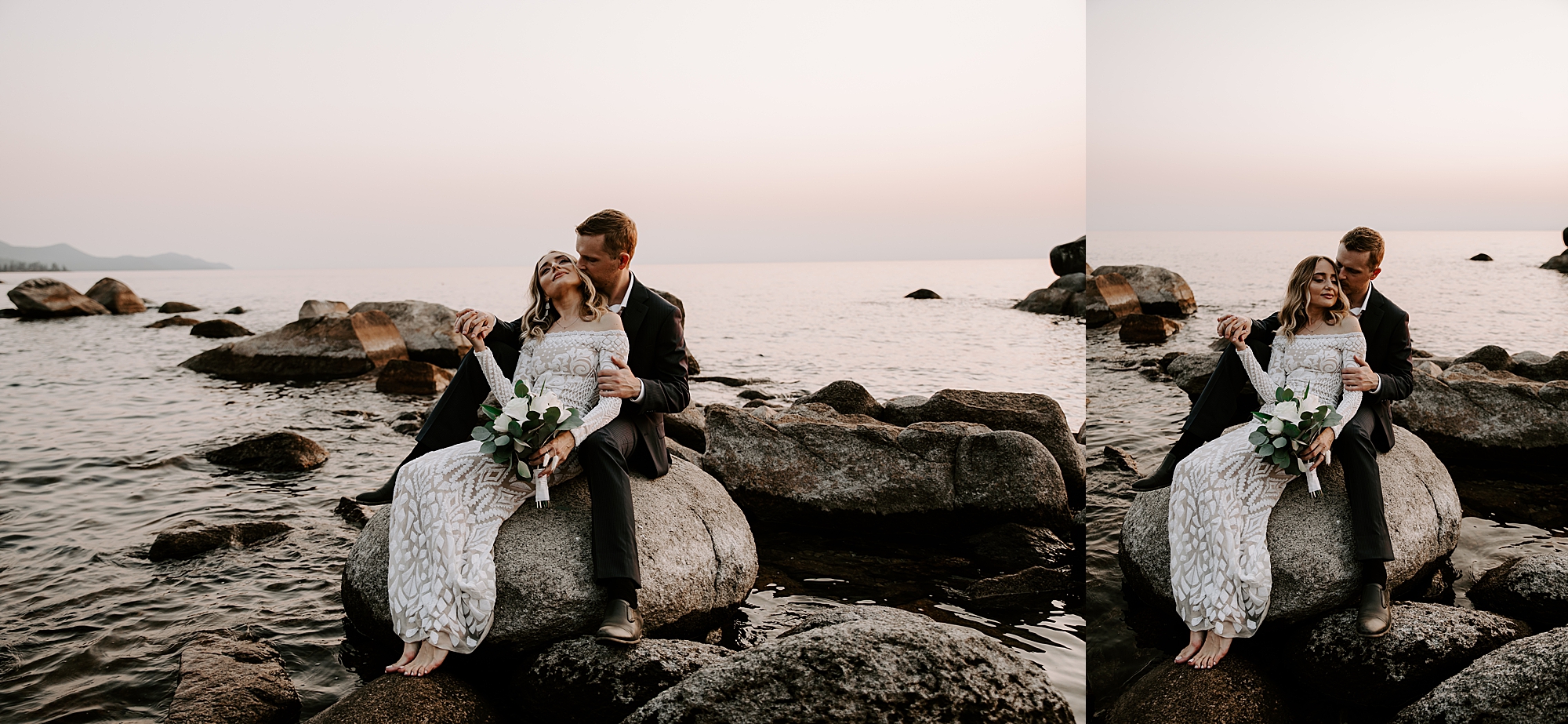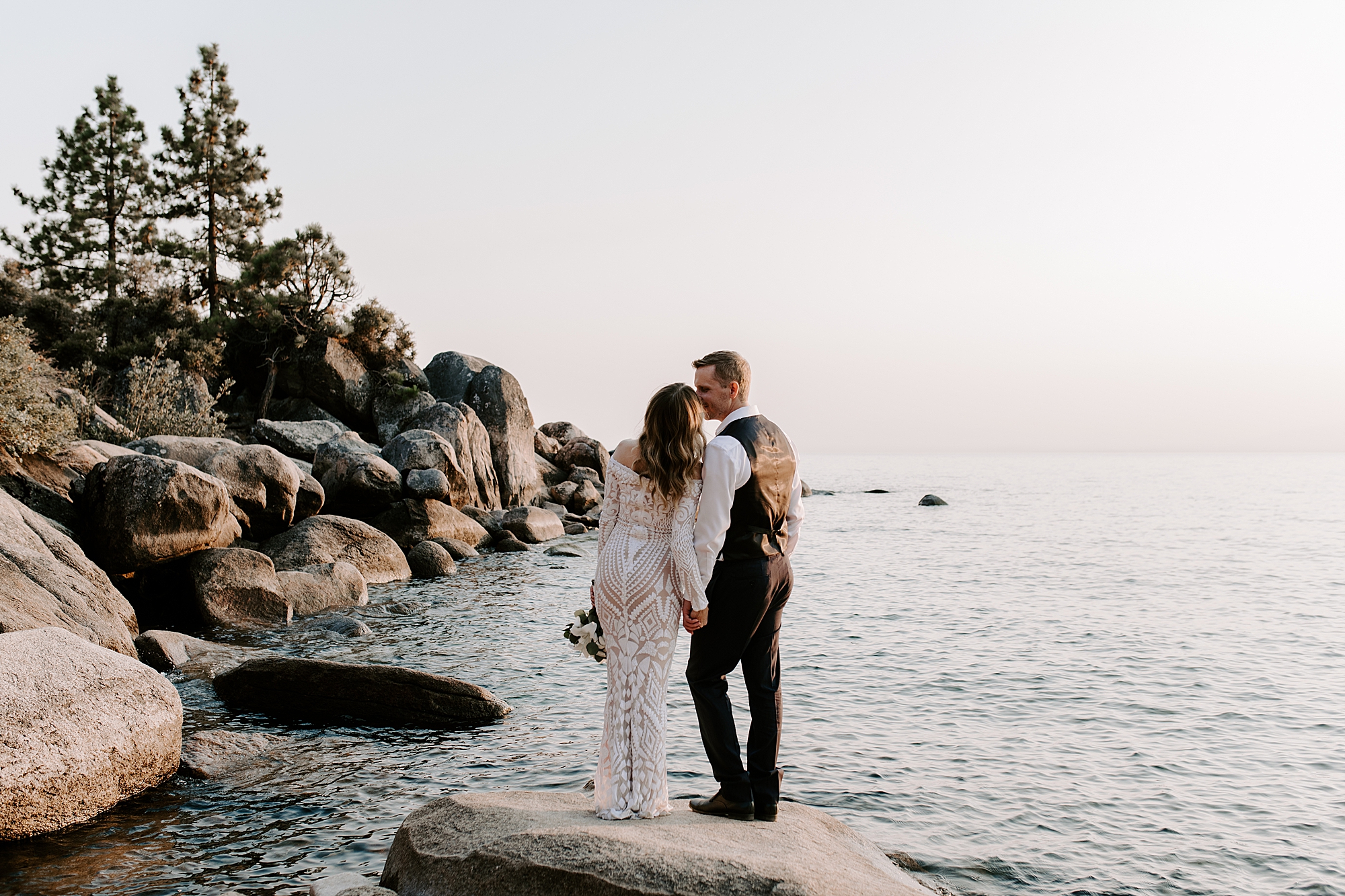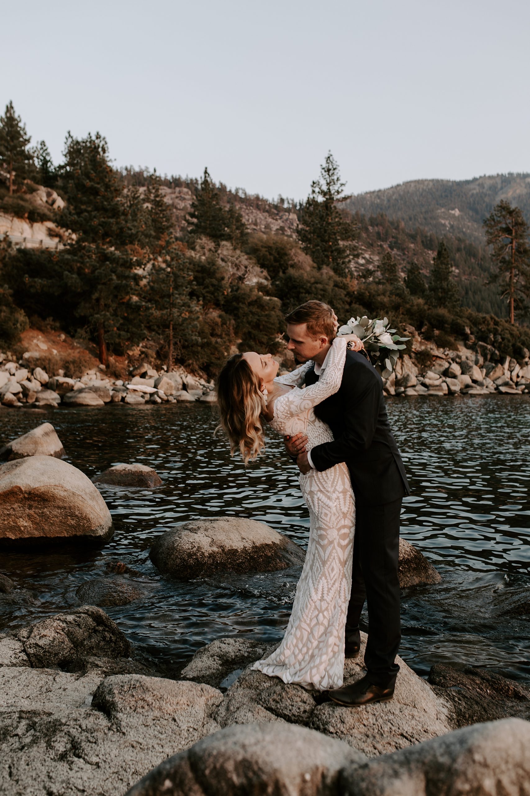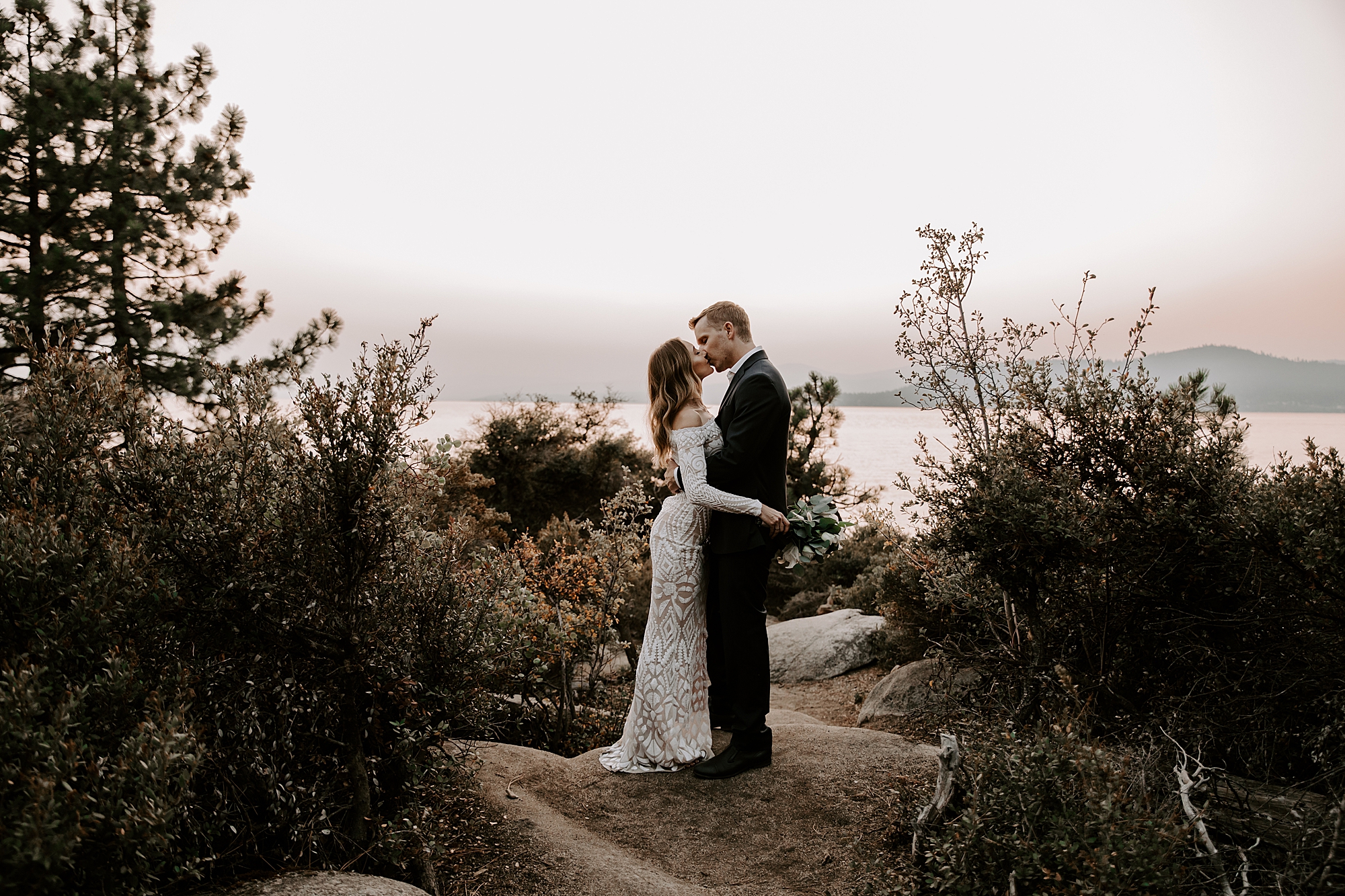 This North Lake Tahoe elopement felt like a fairytale! Elena and Oleg opted for a quiet ceremony North Lake Tahoe, and we all enjoyed being on “Tahoe Time” for the weekend. We began by the shore with a short and sweet ceremony with just the two of them. They wanted a true elopement-style ceremony, and this rocky beach was the perfect location for them to focus on each other.