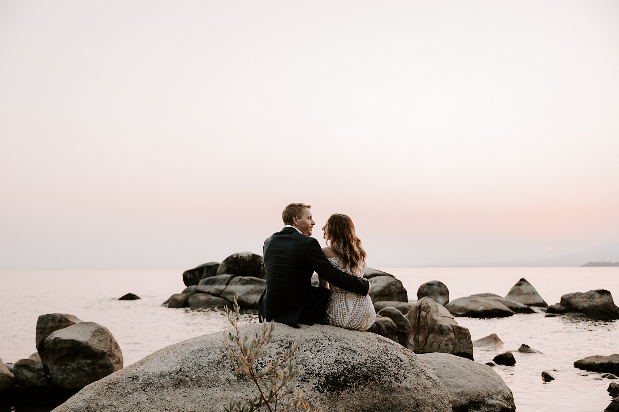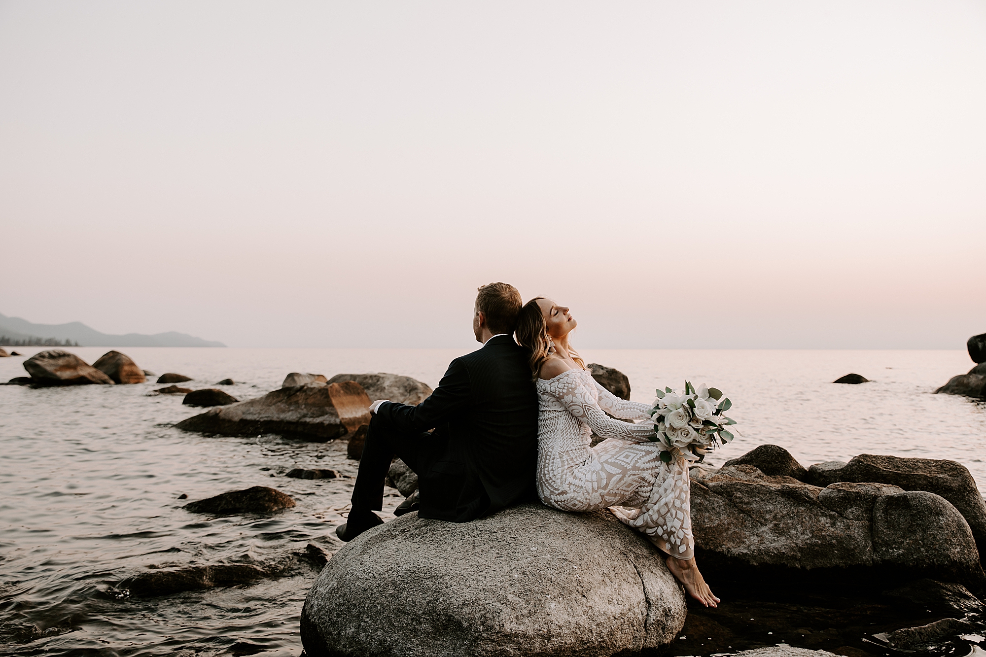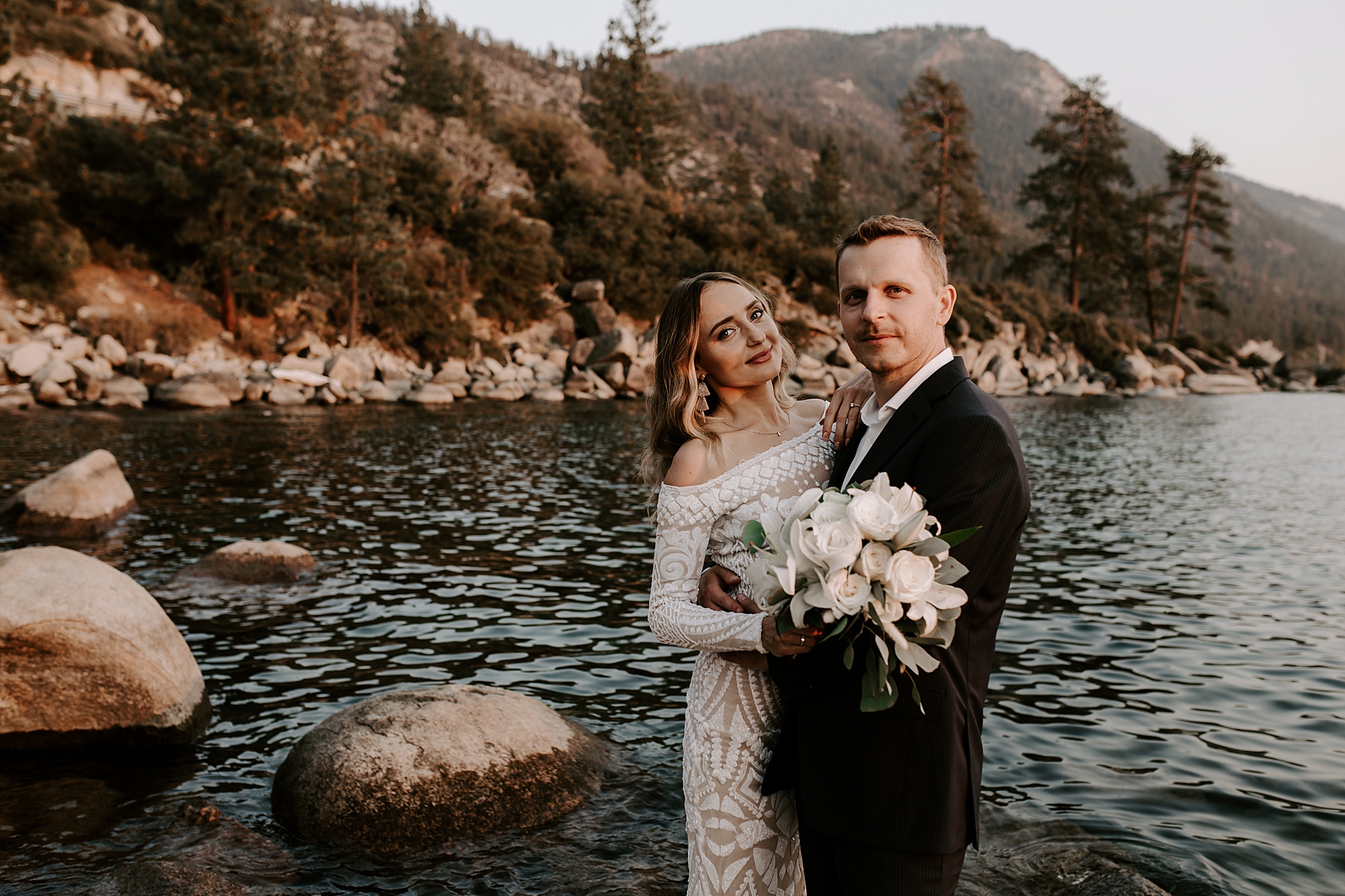 This North Lake Tahoe elopement felt like a fairytale! Elena and Oleg opted for a quiet ceremony North Lake Tahoe, and we all enjoyed being on “Tahoe Time” for the weekend. We began by the shore with a short and sweet ceremony with just the two of them. They wanted a true elopement-style ceremony, and this rocky beach was the perfect location for them to focus on each other.