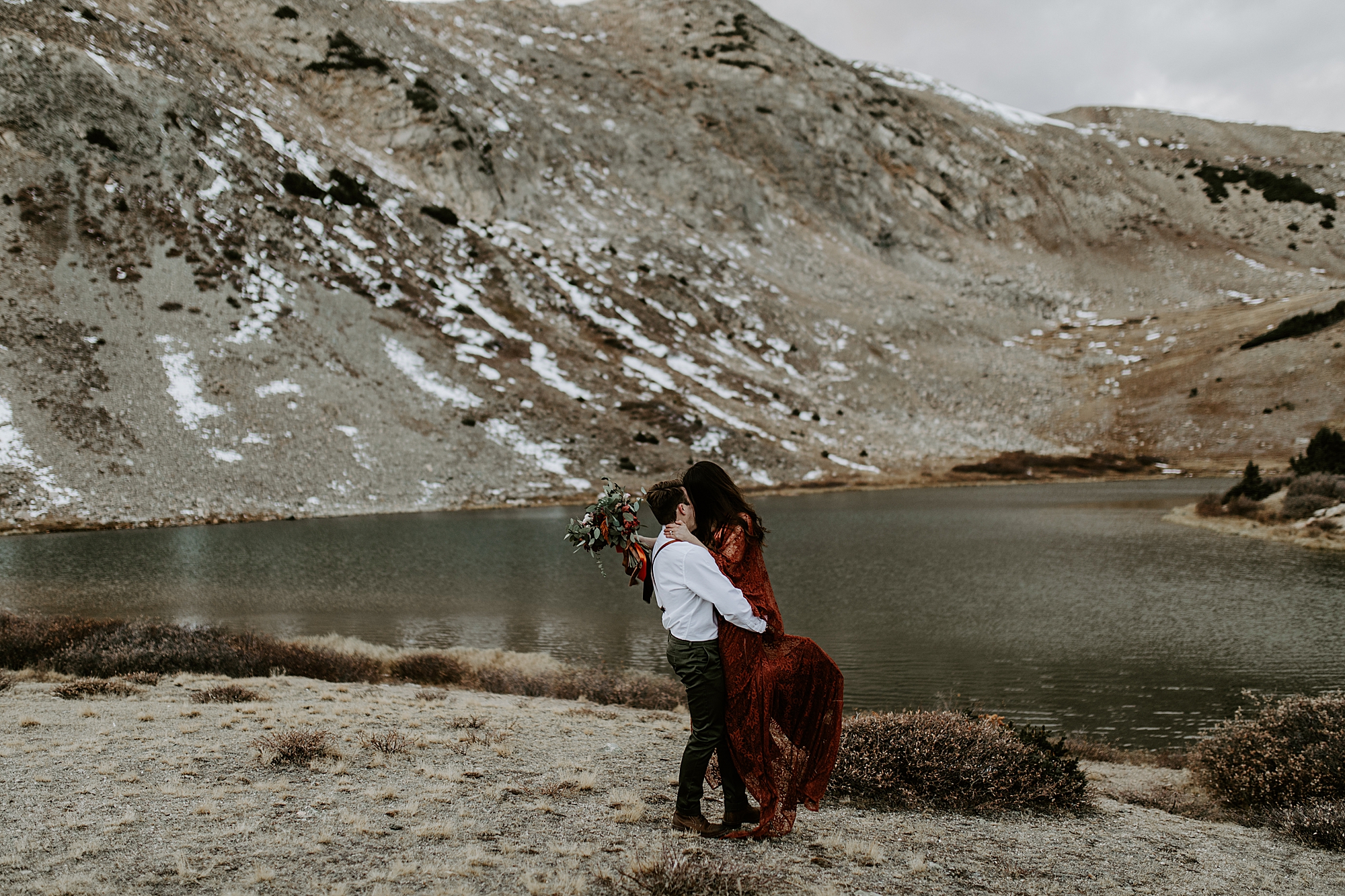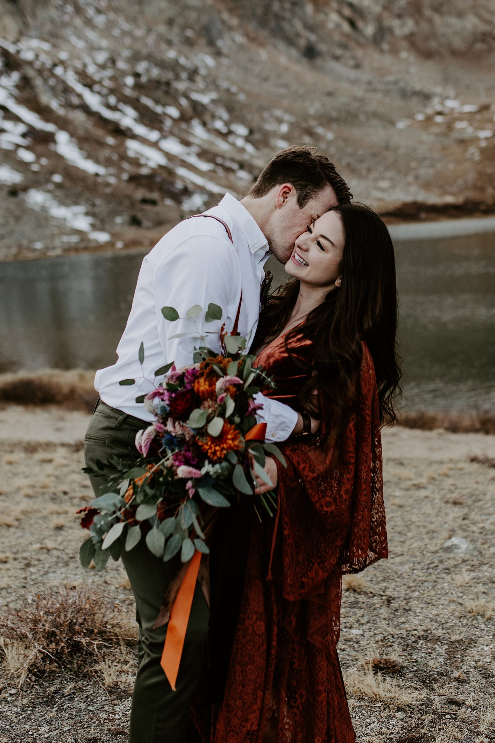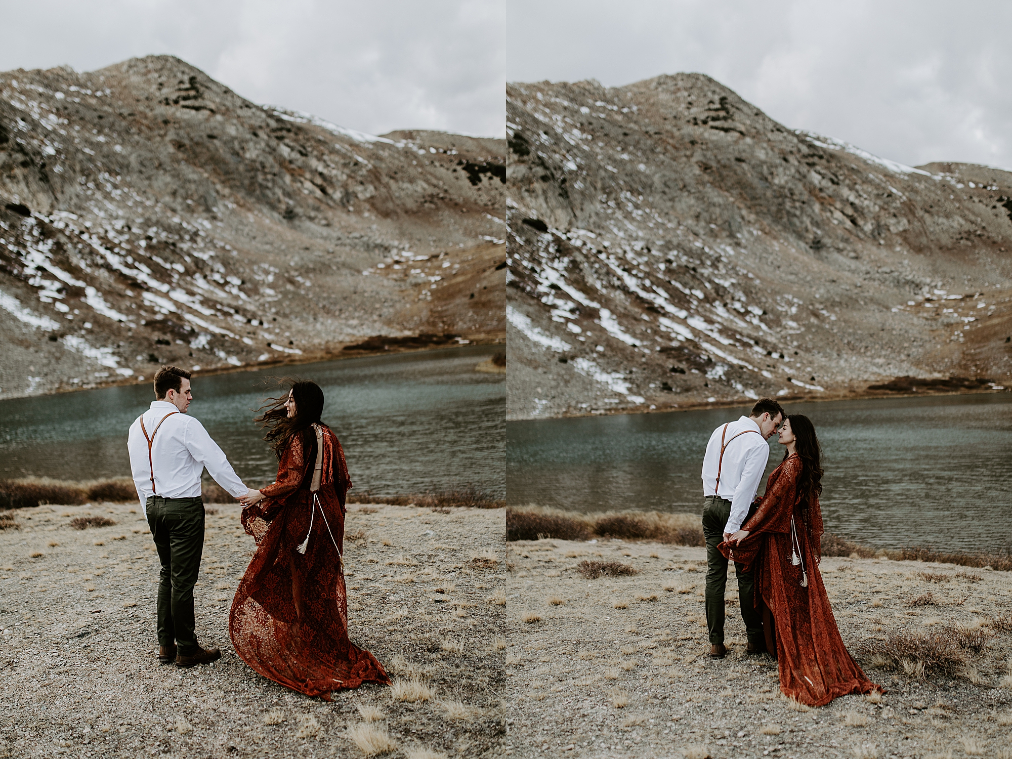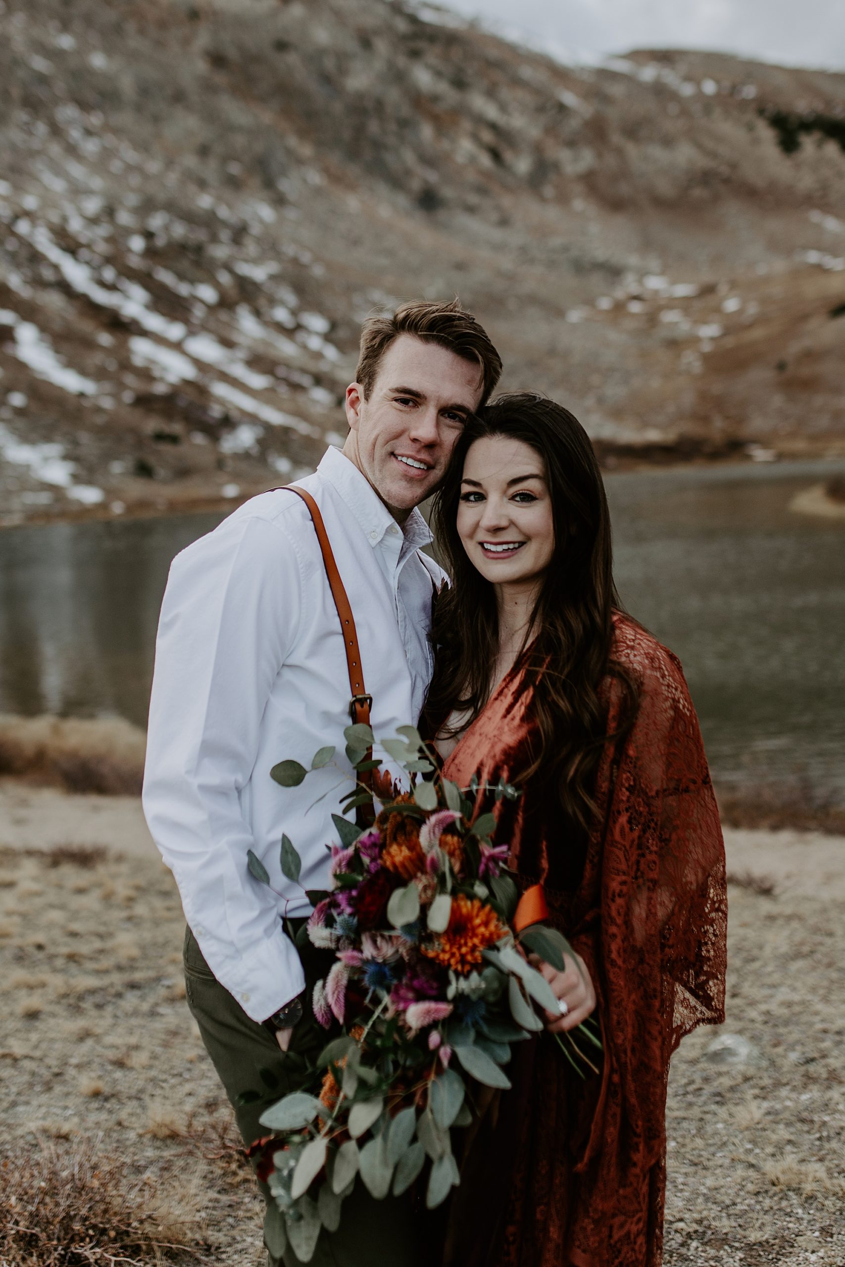 Wow! Isn’t this couple just stunning? And they were just as sweet! Matt and Elise chose to celebrate their love and tie the knot with an intimate elopement in Colorado. Their timing couldn’t have been more perfect. At the time of their session, winter hadn’t set in with full force. There weren’t many tourists since it was in between summer and ski season. We had this incredible mountain lakeside backdrop all to ourselves!