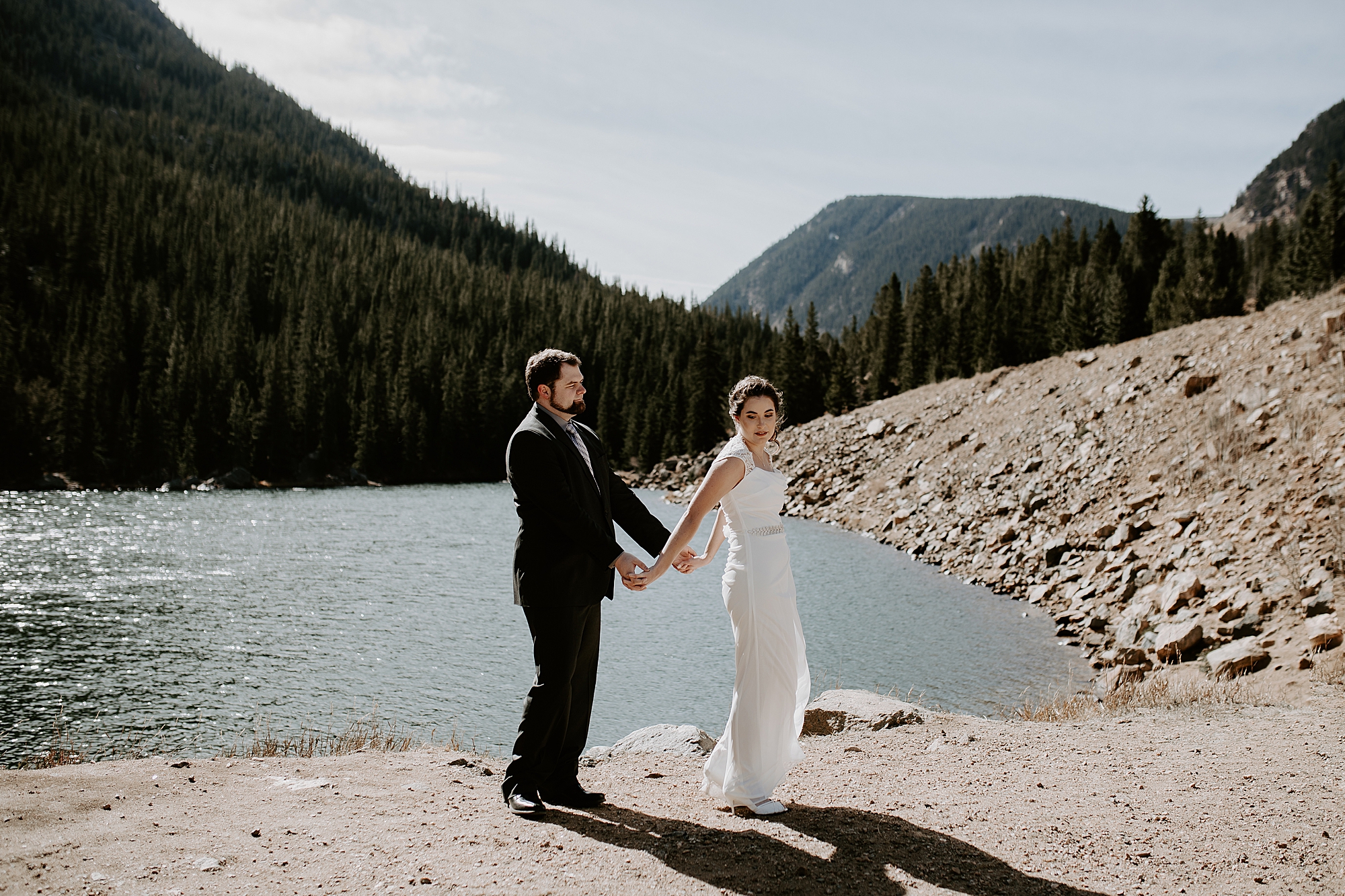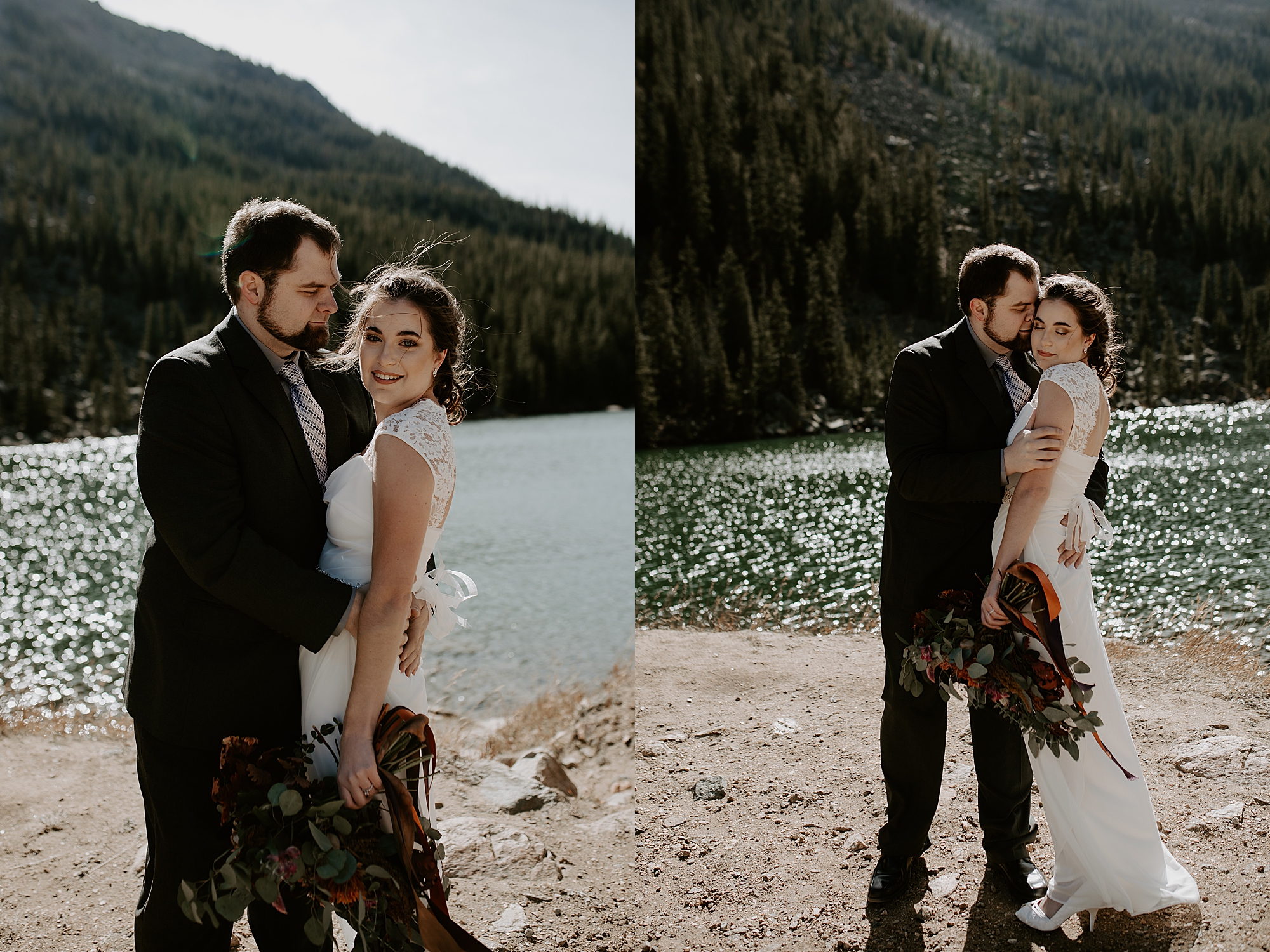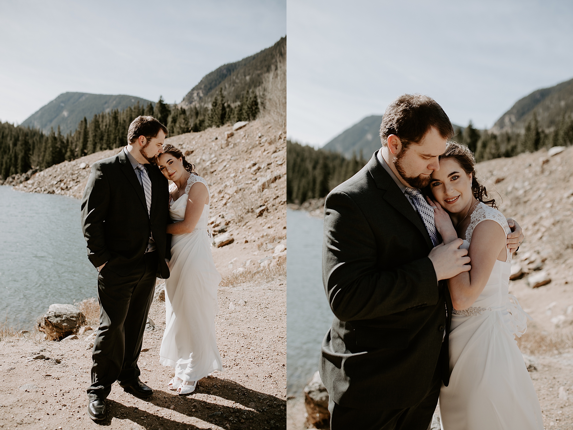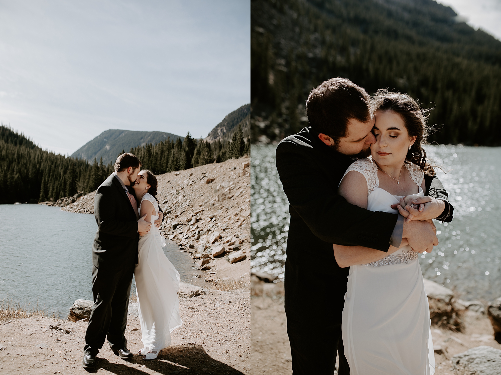 When Kayla and Dalton contacted me about their Colorado elopement, I couldn’t wait to begin scouting out ceremony locations for them. They wanted a true elopement – just the two of them and the breathtaking mountainside for the ceremony. After some hiking and research, I stumbled upon Guanella Pass, Colorado near Mount Bierstadt. This unique pass straddles a steep divide, so it has some diverse scenery. When I came upon this small lake, I knew the lighting would be stunning for photographs. Plus, a thick forest surrounds the lake so that we could get those romantic woodsy shots.
