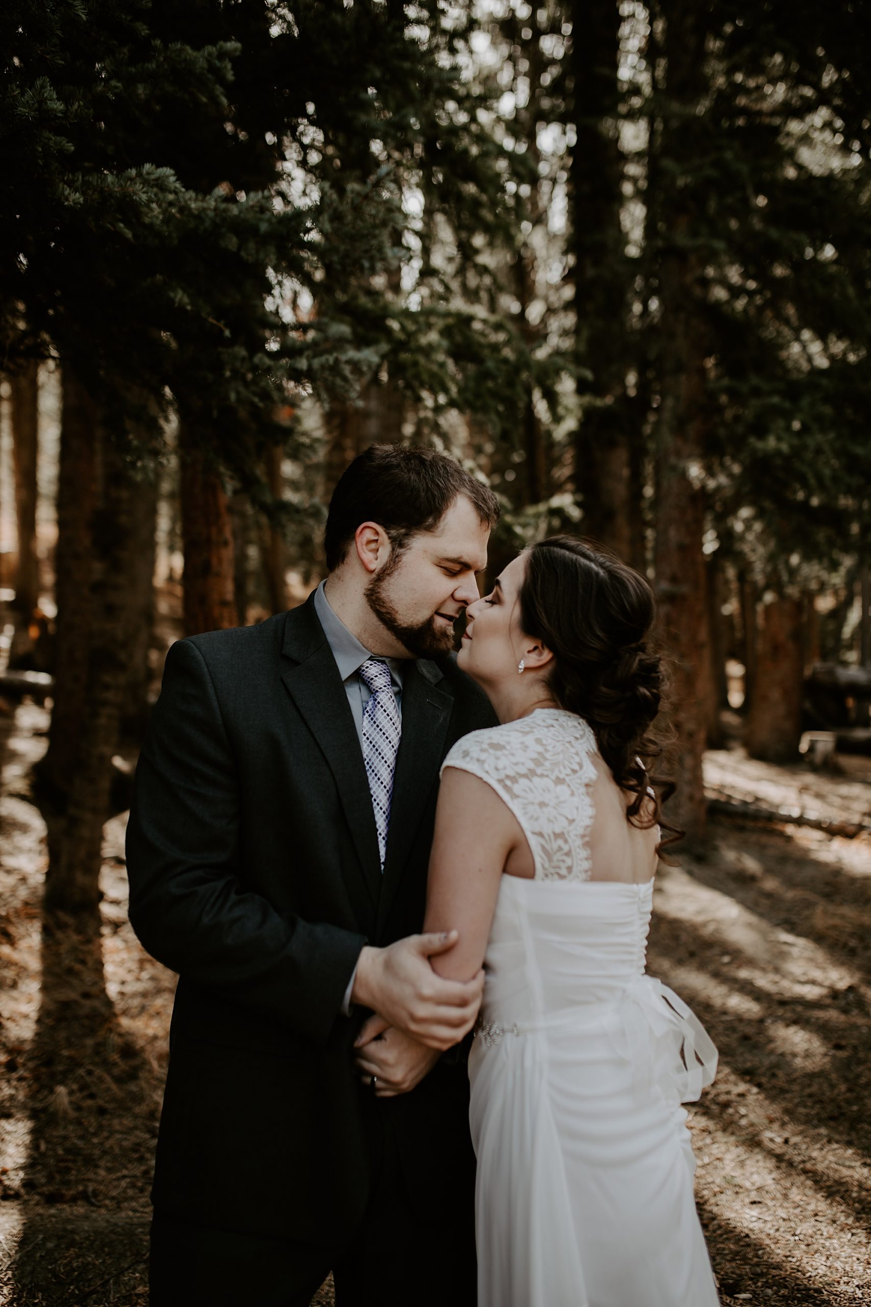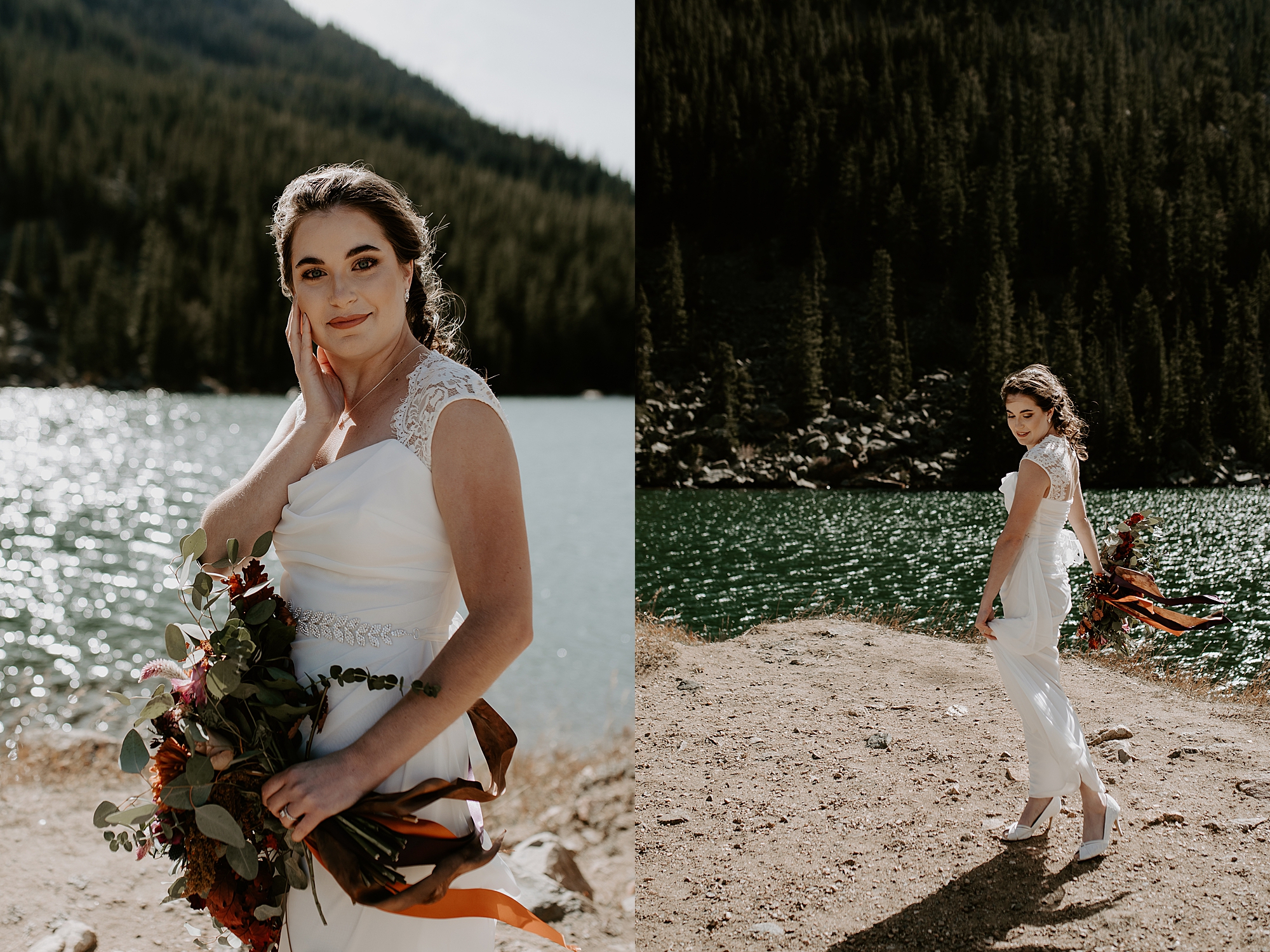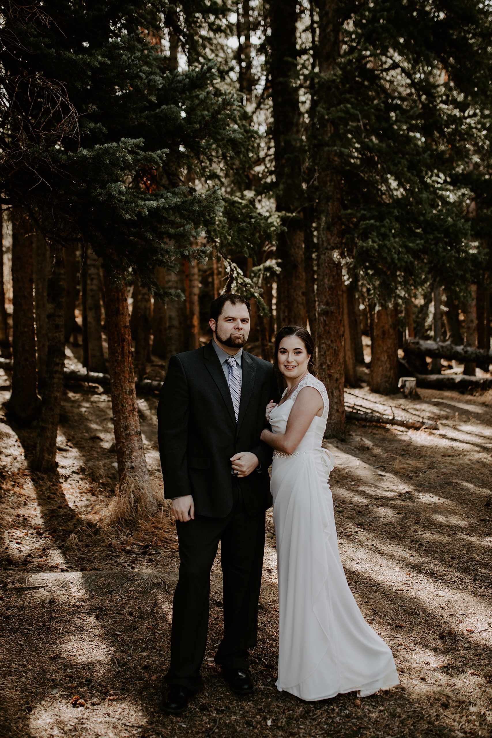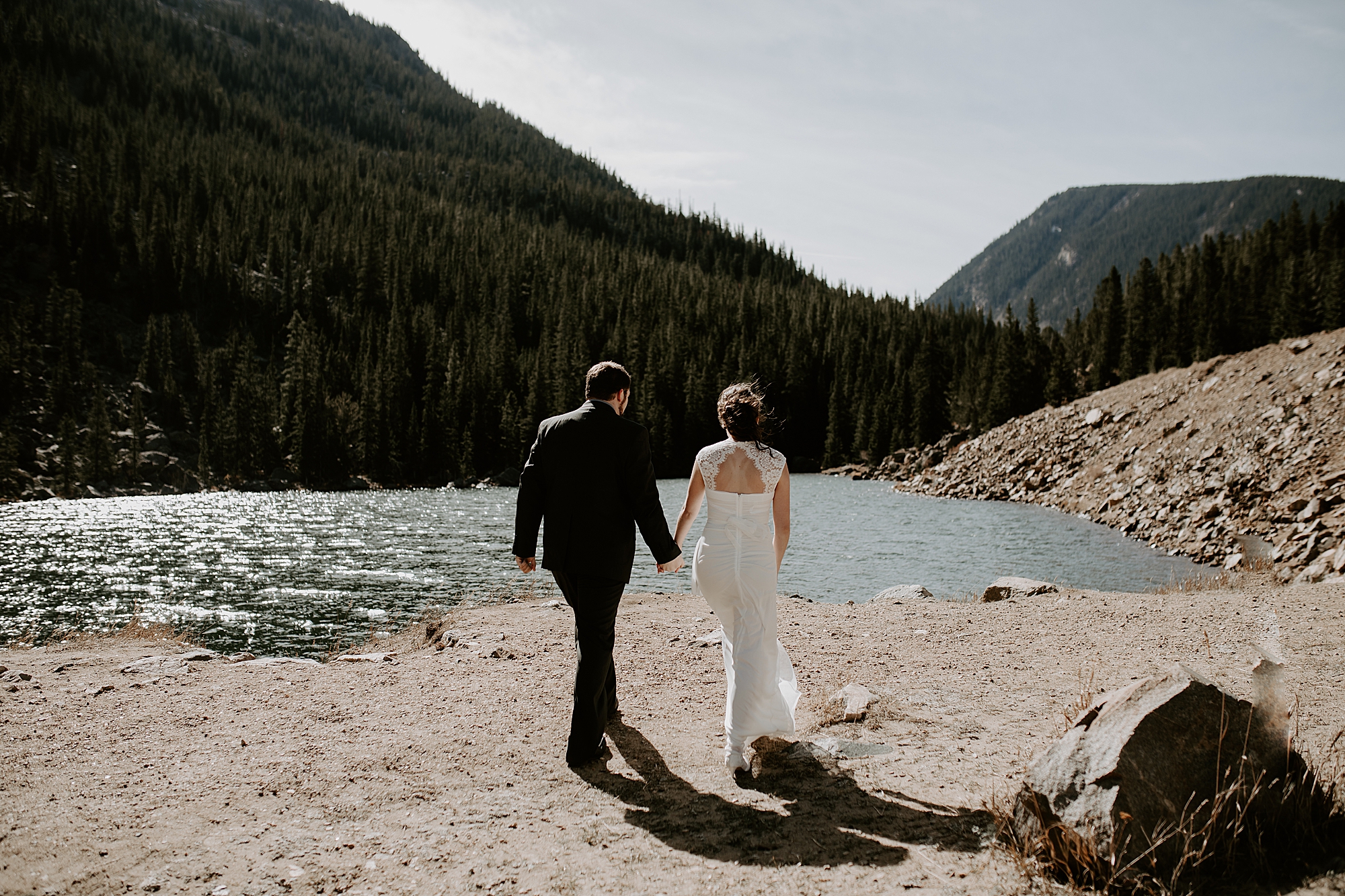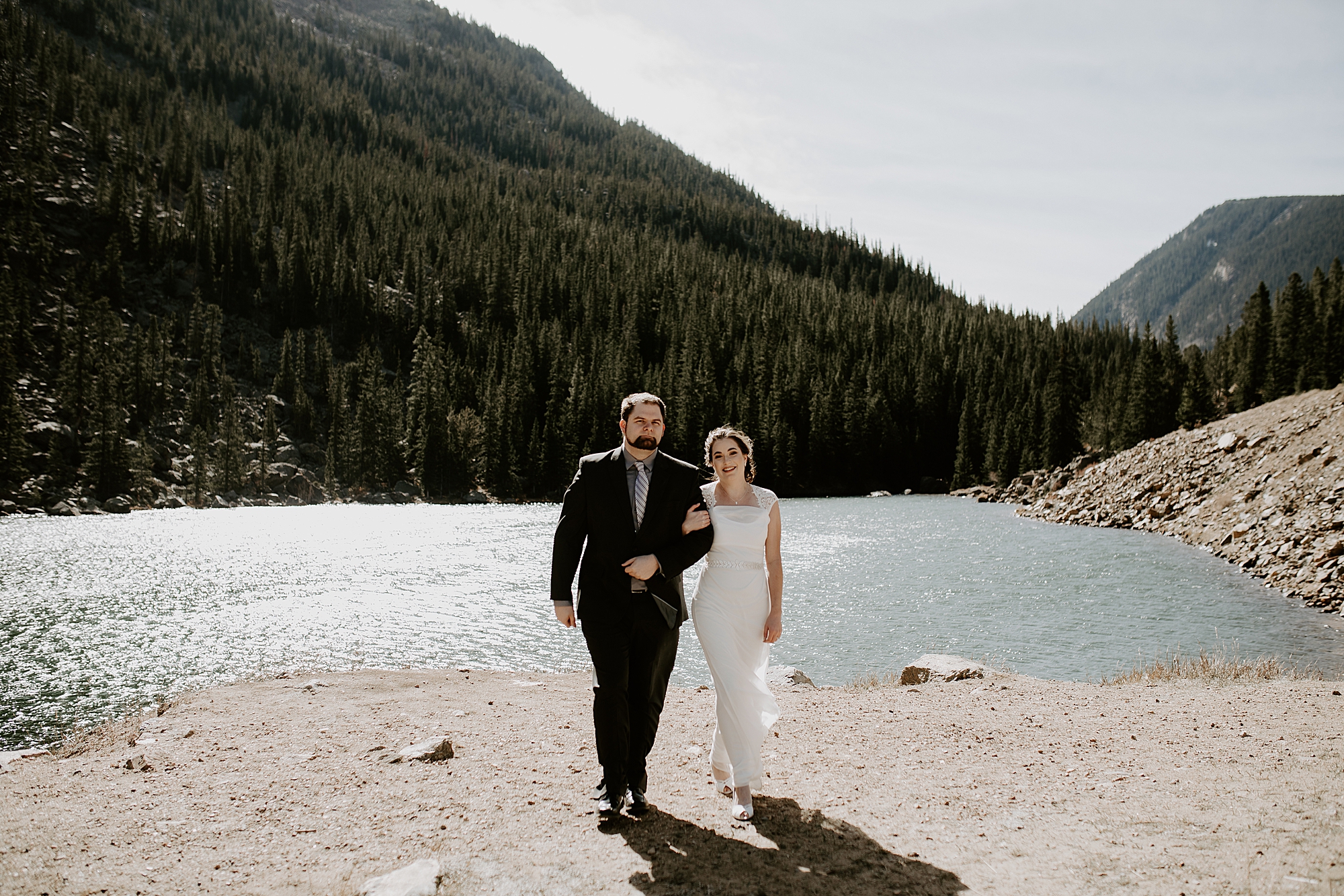 When Kayla and Dalton contacted me about their Colorado elopement, I couldn’t wait to begin scouting out ceremony locations for them. They wanted a true elopement – just the two of them and the breathtaking mountainside for the ceremony. After some hiking and research, I stumbled upon Guanella Pass, Colorado near Mount Bierstadt. This unique pass straddles a steep divide, so it has some diverse scenery. When I came upon this small lake, I knew the lighting would be stunning for photographs. Plus, a thick forest surrounds the lake so that we could get those romantic woodsy shots.