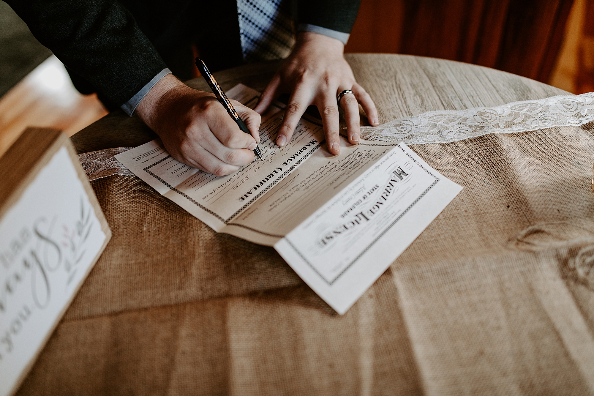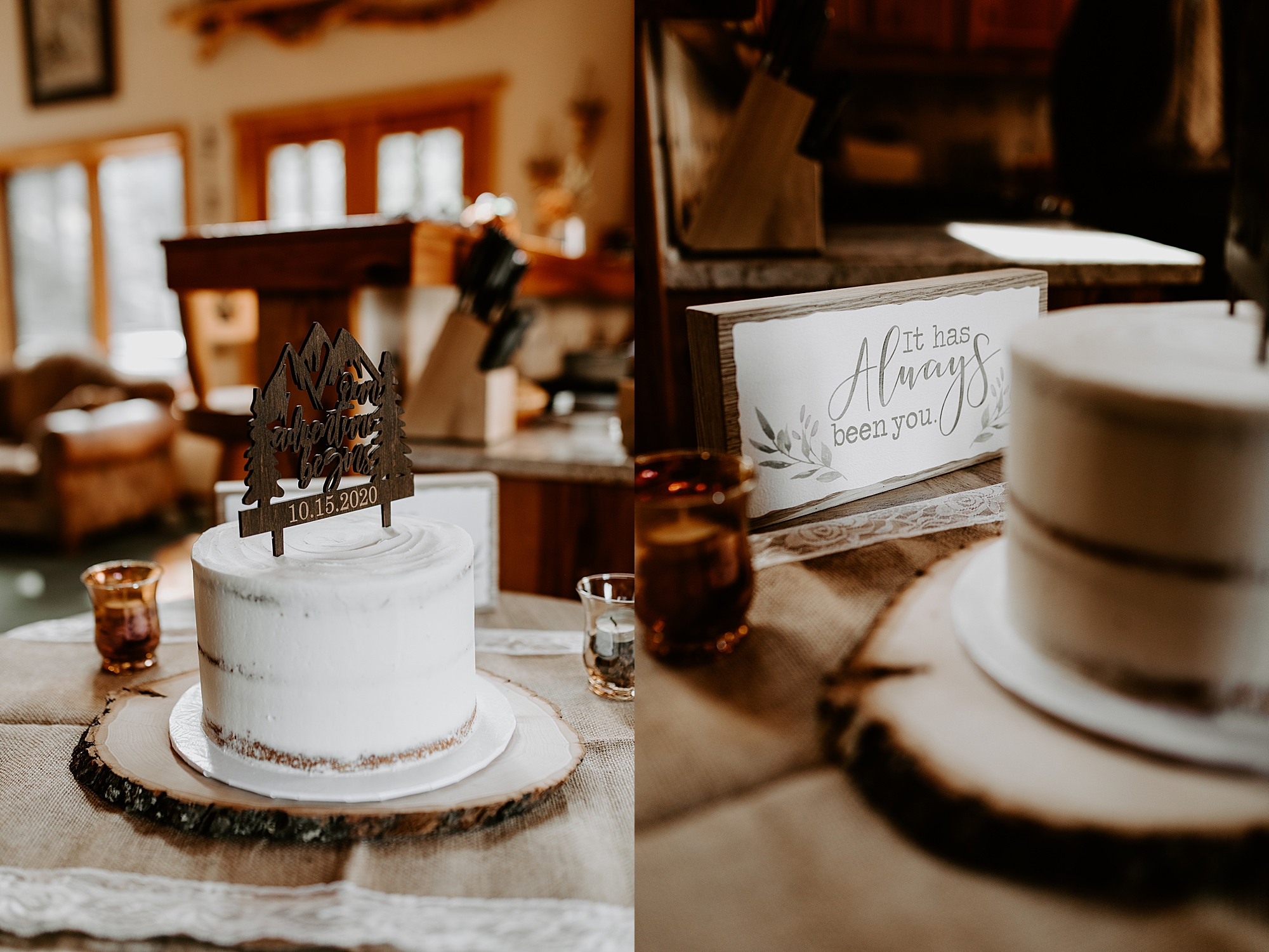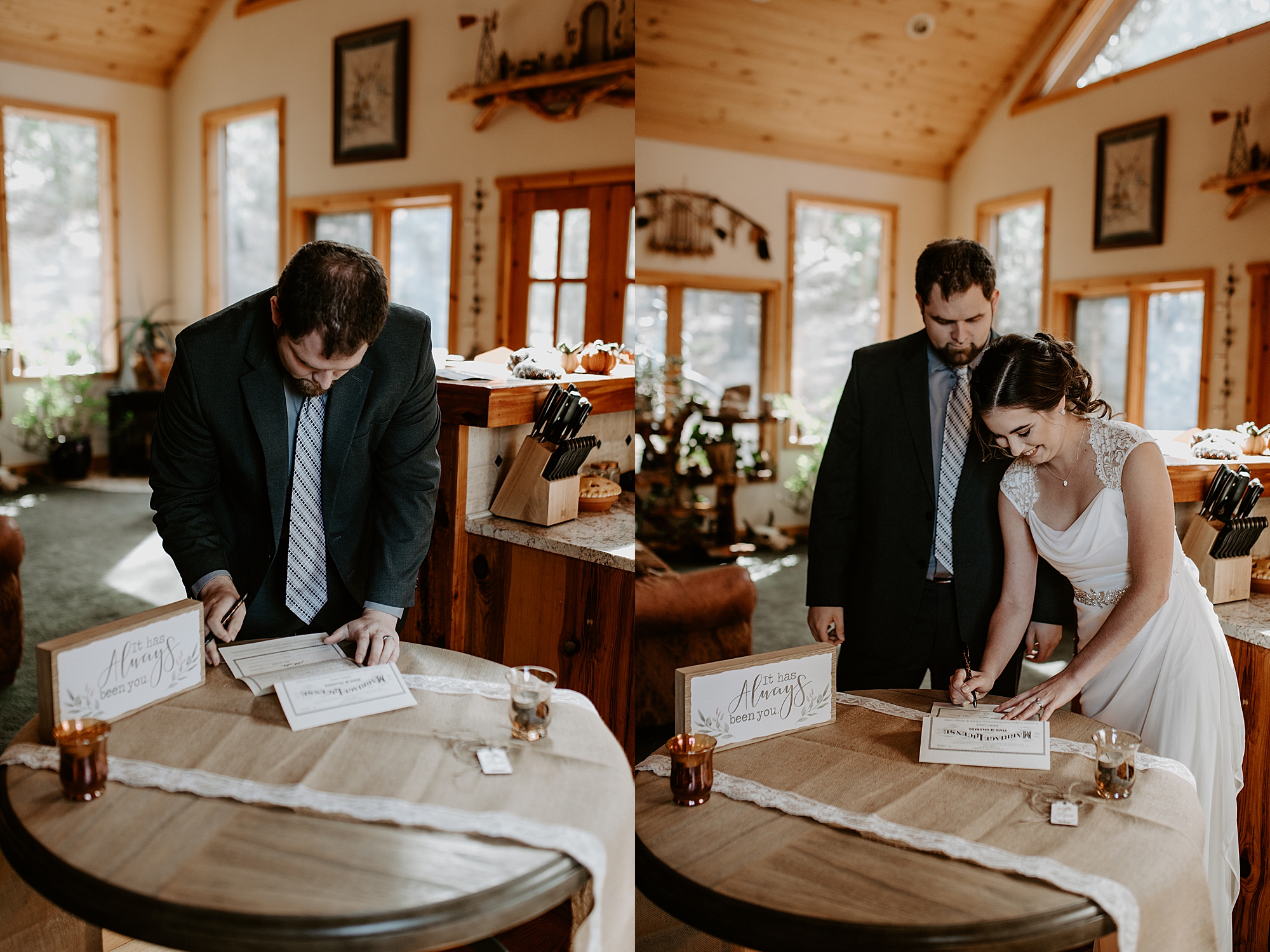 After their lakeside ring exchange, we headed into the trees for a few non-windswept shots. The moment felt so peaceful and sacred. Then, when they were ready, we met a few of their friends back at their cabin to sign the marriage license. Even an elopement wouldn’t be complete without wedding cake cutting and some photos with friends!