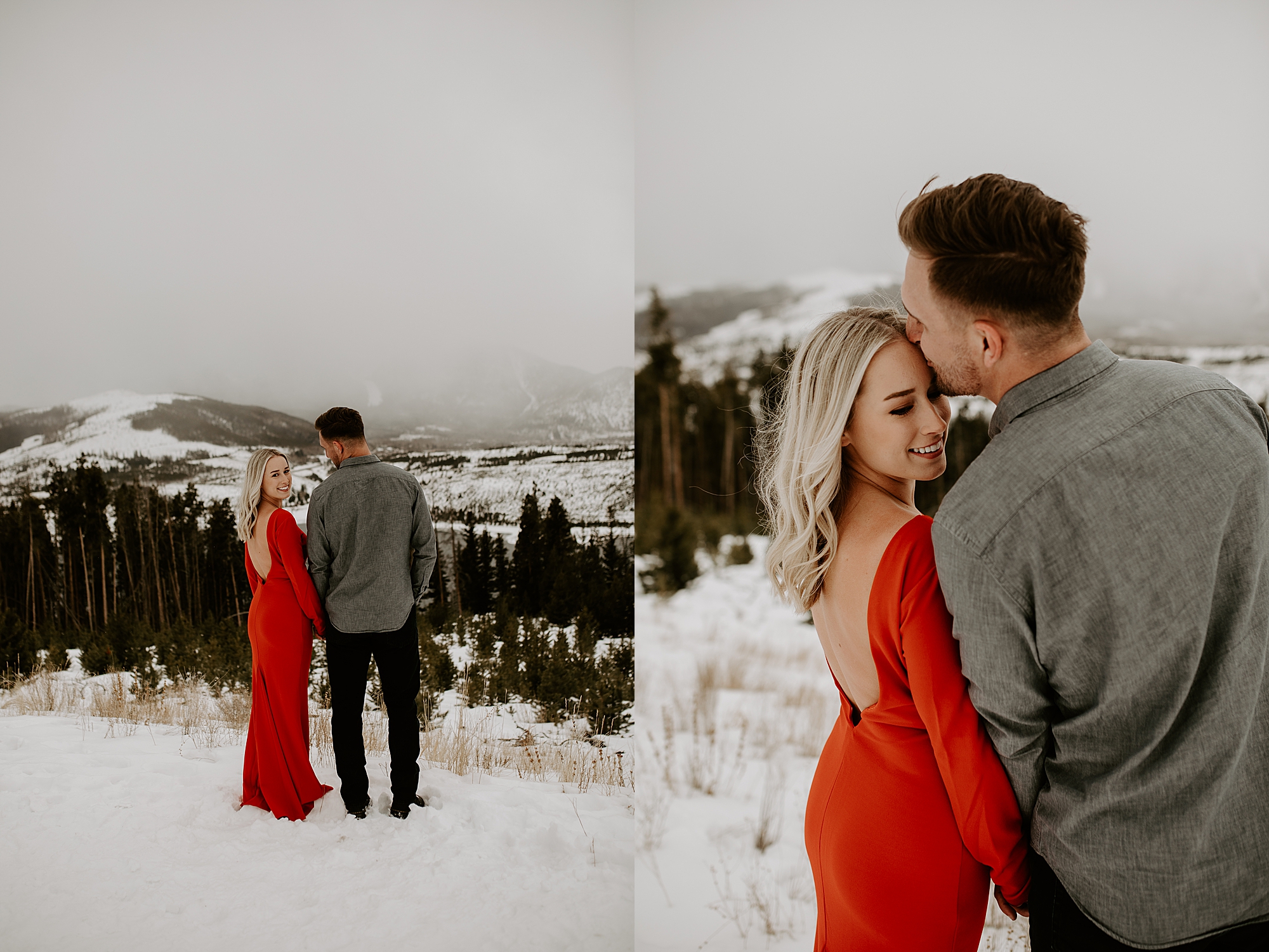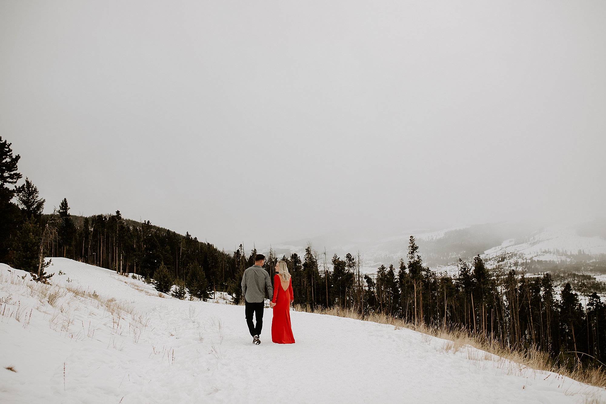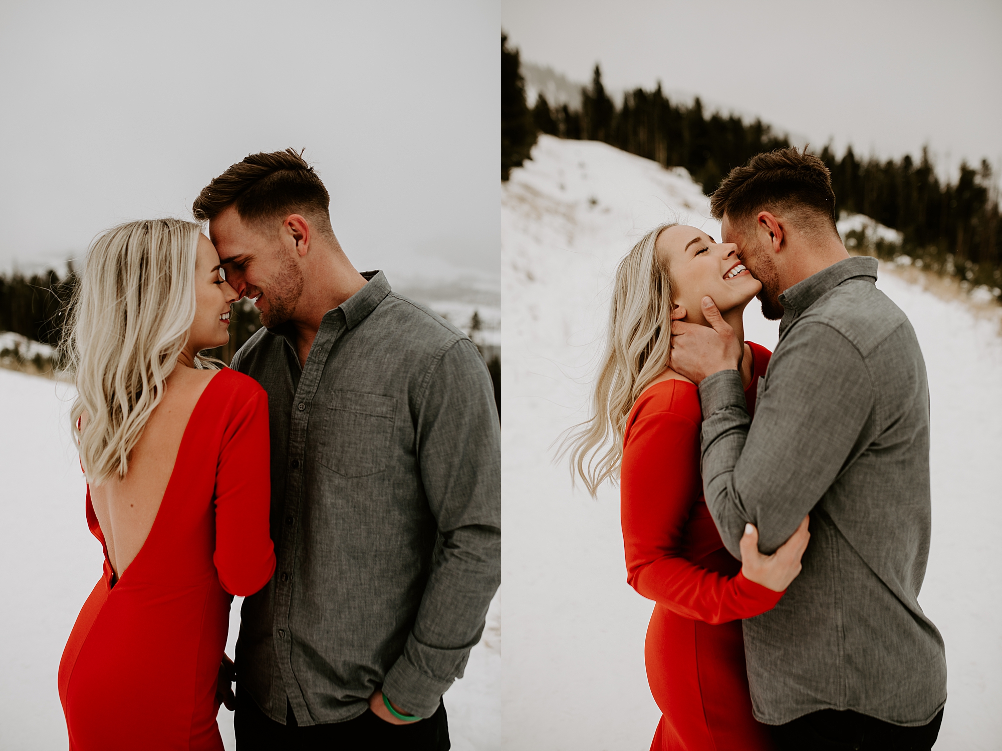 Even with the snow falling all around us, this romantic engagement session was HOT! Bree had a gorgeous winter session red-dress vision, and these two nailed it. She looked strikingly elegant against the wintry backdrop. I was worried Bree might get cold in her backless gown, but Bree and Kyle are Wisconsinites and can handle the cold. He snuggled her close, and they danced and spun their way across the snow to keep warm. They wanted something a little more adventurous for their engagement session, so they called me to plan a quick getaway to beautiful Colorado.