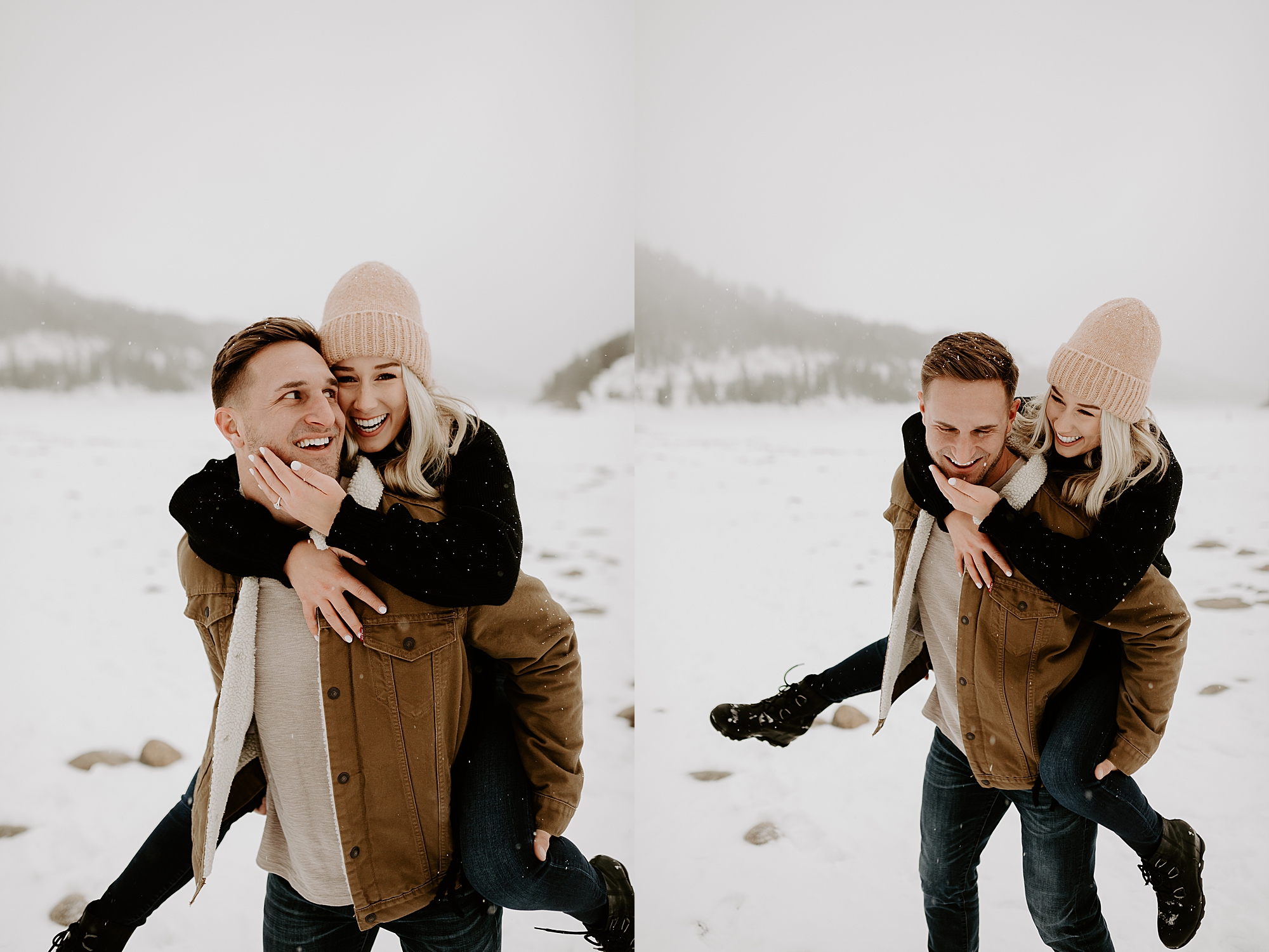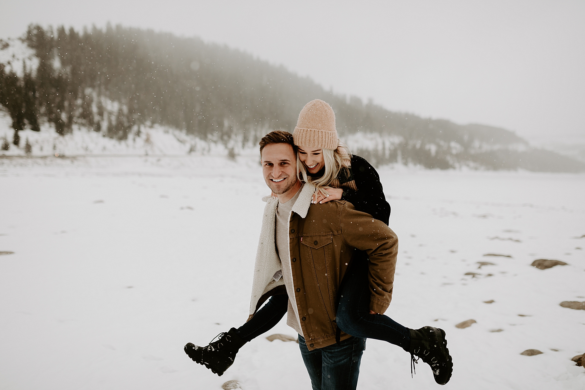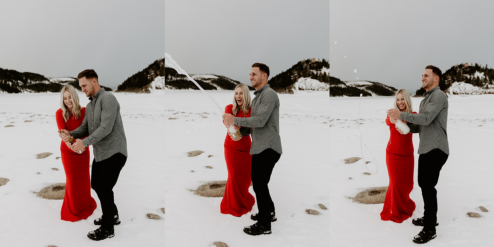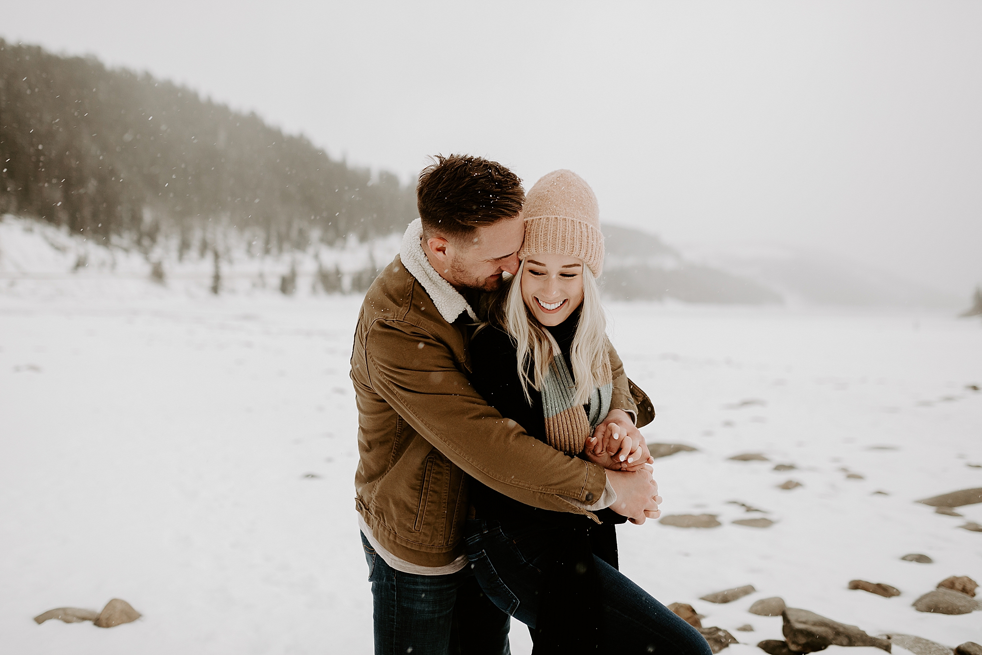 Even with the snow falling all around us, this romantic engagement session was HOT! Bree had a gorgeous winter session red-dress vision, and these two nailed it. She looked strikingly elegant against the wintry backdrop. I was worried Bree might get cold in her backless gown, but Bree and Kyle are Wisconsinites and can handle the cold. He snuggled her close, and they danced and spun their way across the snow to keep warm. They wanted something a little more adventurous for their engagement session, so they called me to plan a quick getaway to beautiful Colorado.