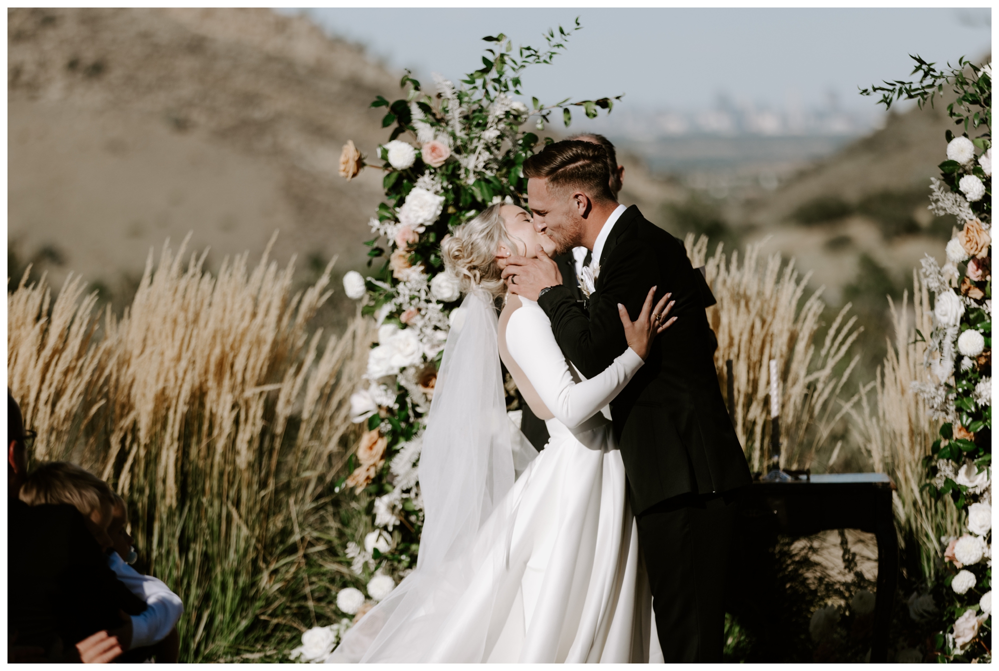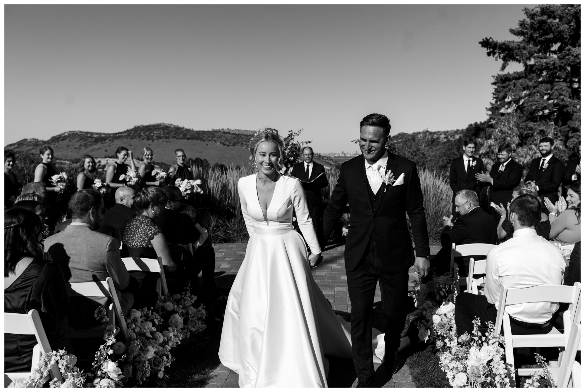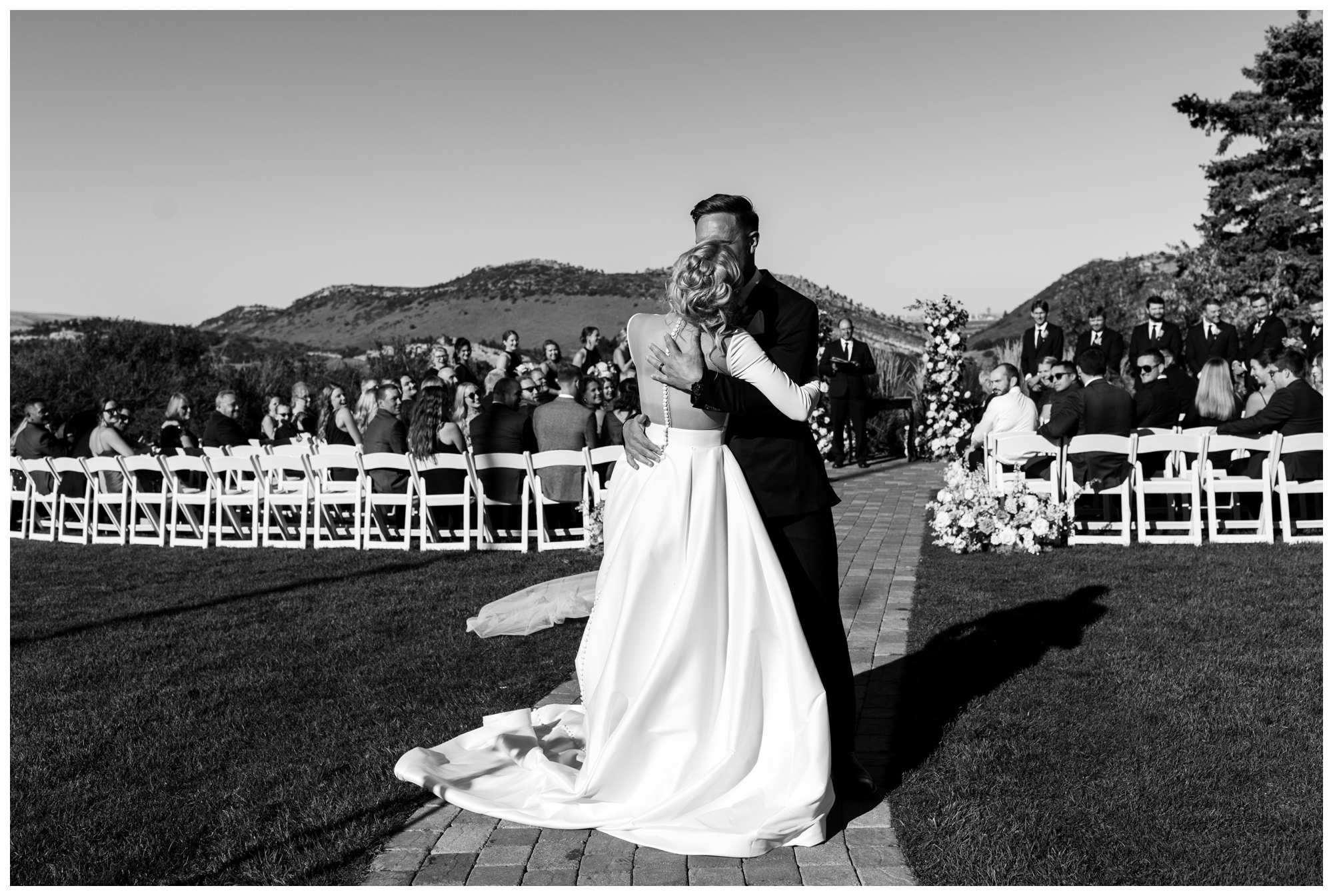 Now, the Manor is open to welcome guests who want to host an elegant celebration with stunning views of the Colorado Rockies and the Denver skyline. One of the most remarkable things about this property is the ceremony setup in front of the Dakota Hogback—a sharp dip between two hillsides—and you can see Denver right in the middle! It makes for really unique landscape photos.