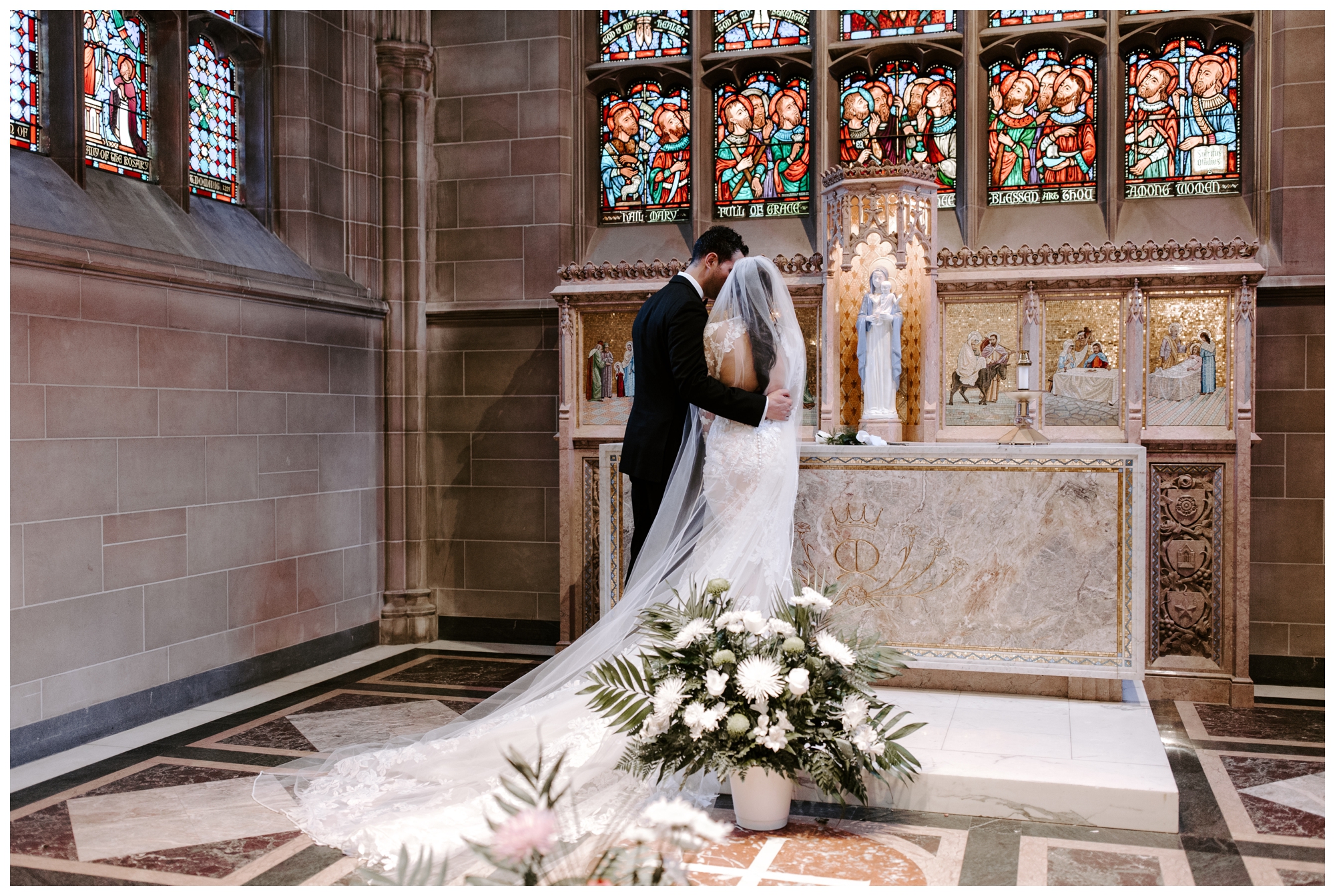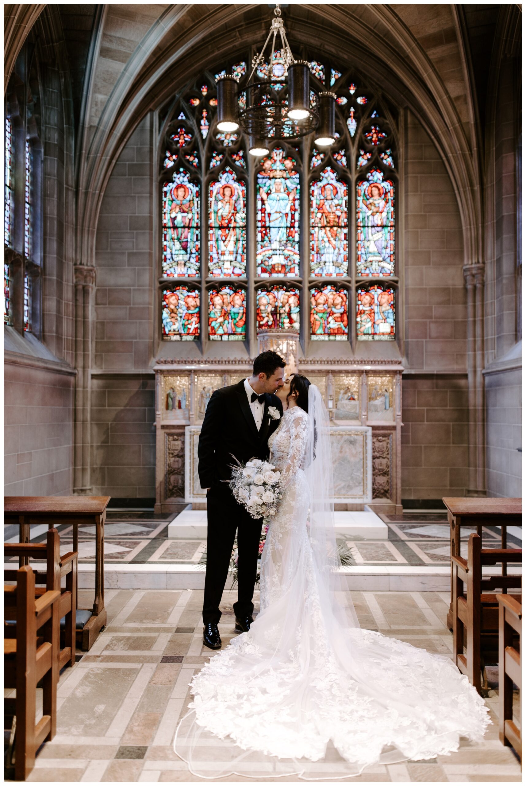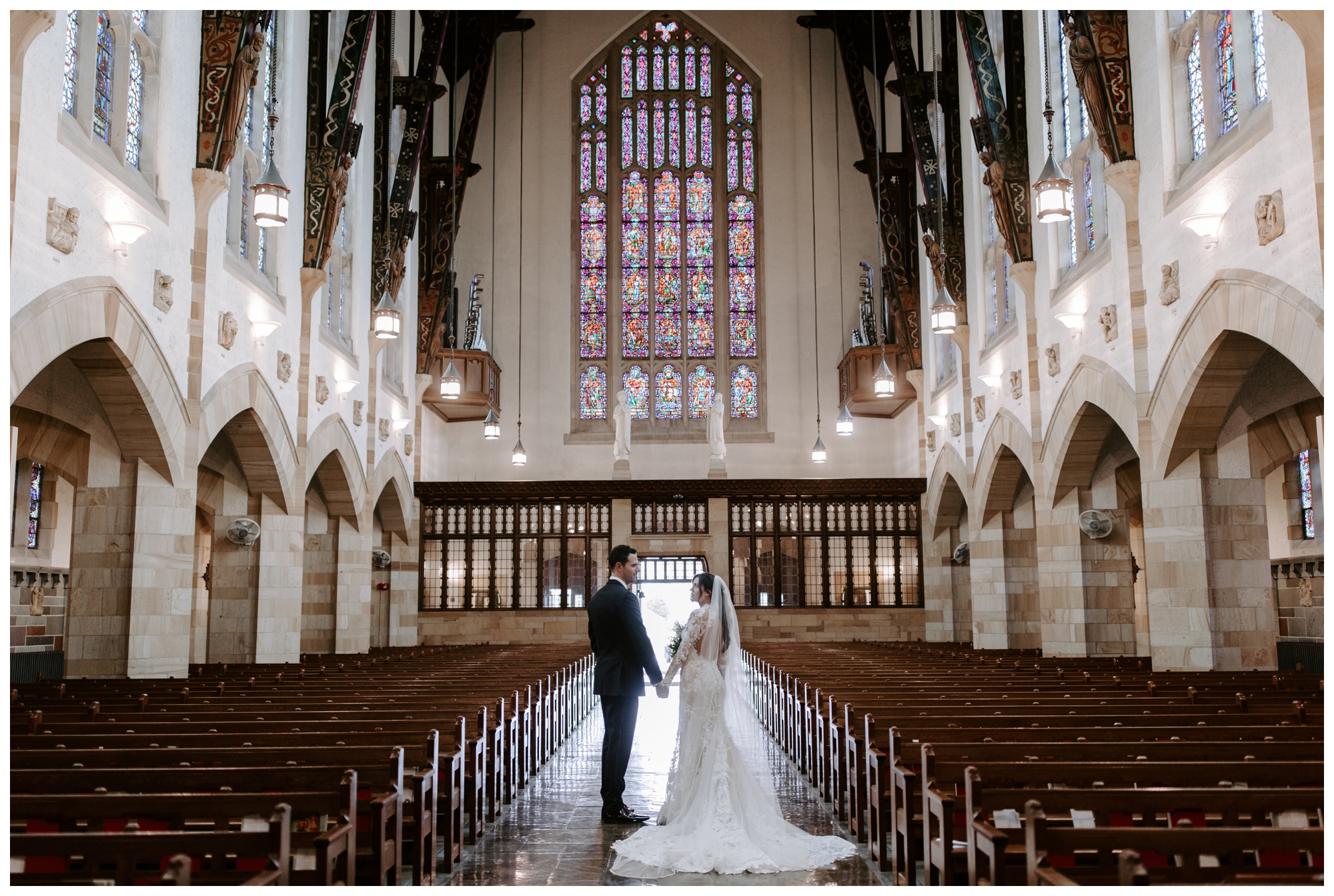 It’s rare to find historic venues with such amazing light. The Mansions on Fifth feature walls of windows in every room, allowing plenty of natural light to brighten the space. We took tons of photos inside the church and the reception venue, and both offered gorgeous lighting via oversized windows and ornate stained glass.
