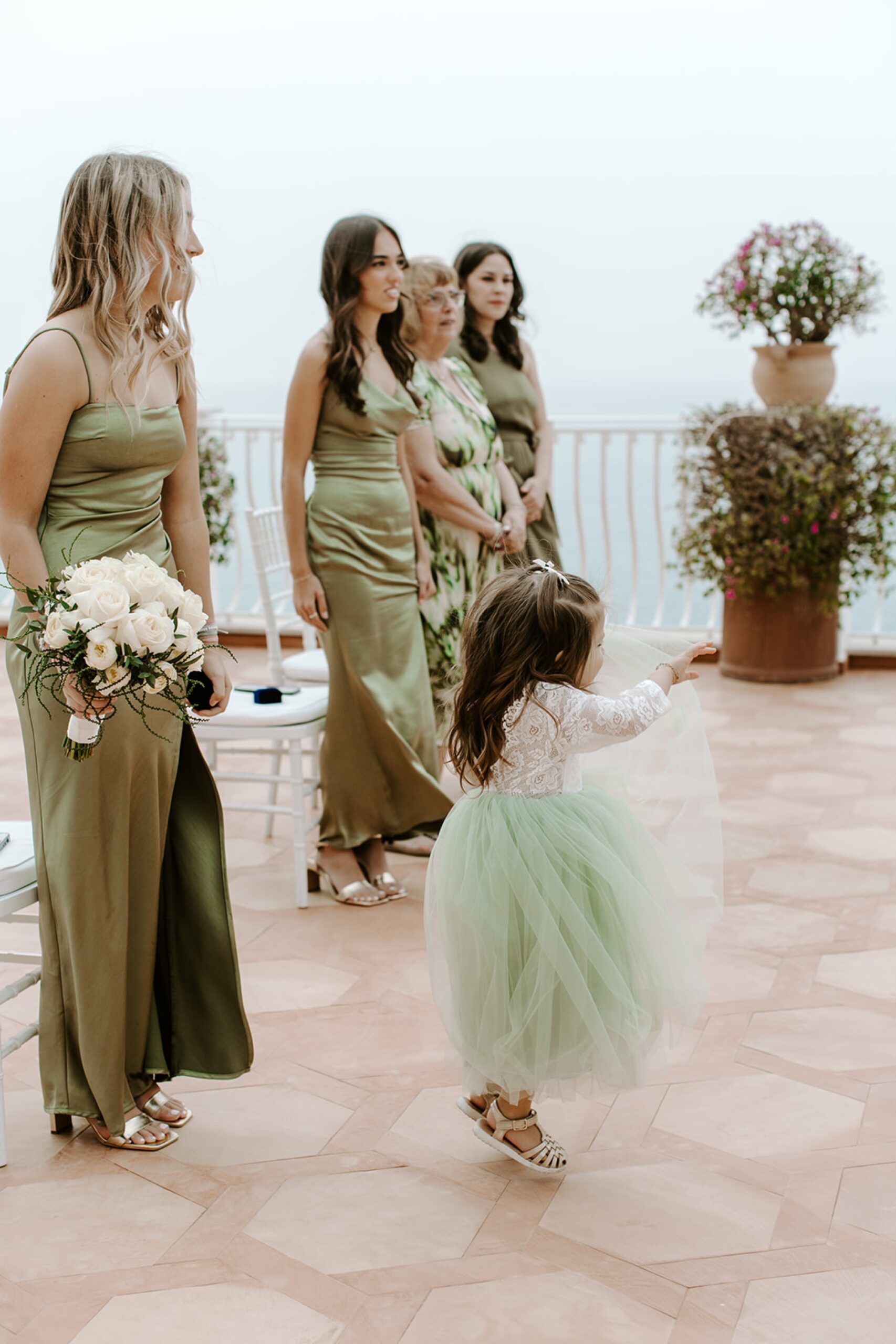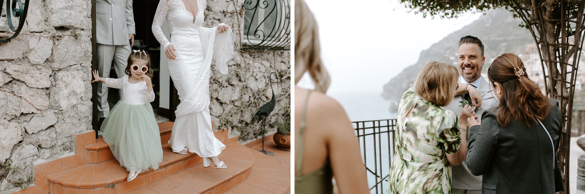 Chelsea and Jamie shared a sweet, private first look on the upper terrace before heading down together for the ceremony. I love how they chose to do things their way by walking the “aisle” together. The ceremony took place on an intimate terrace with a few immediate family members. (My camera loved her darling daughter, and she loved it right back, showing off the cutest poses!). The villa-studded cliffs and foggy sea made for the most breathtaking ceremony moments!
